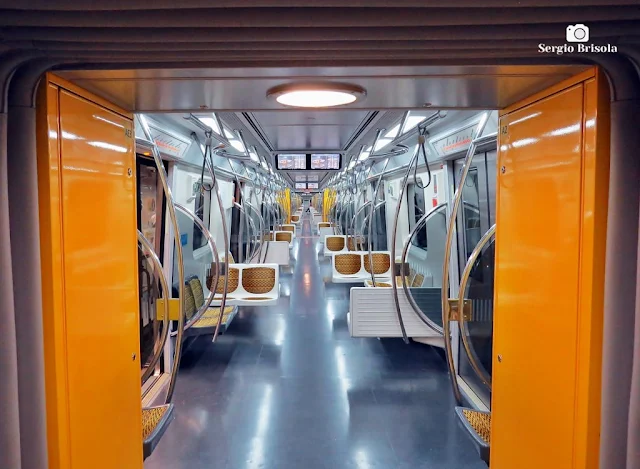Vista ampla da parte interna de um dos modernos trens da Linha Amarela do Metrô de São Paulo.